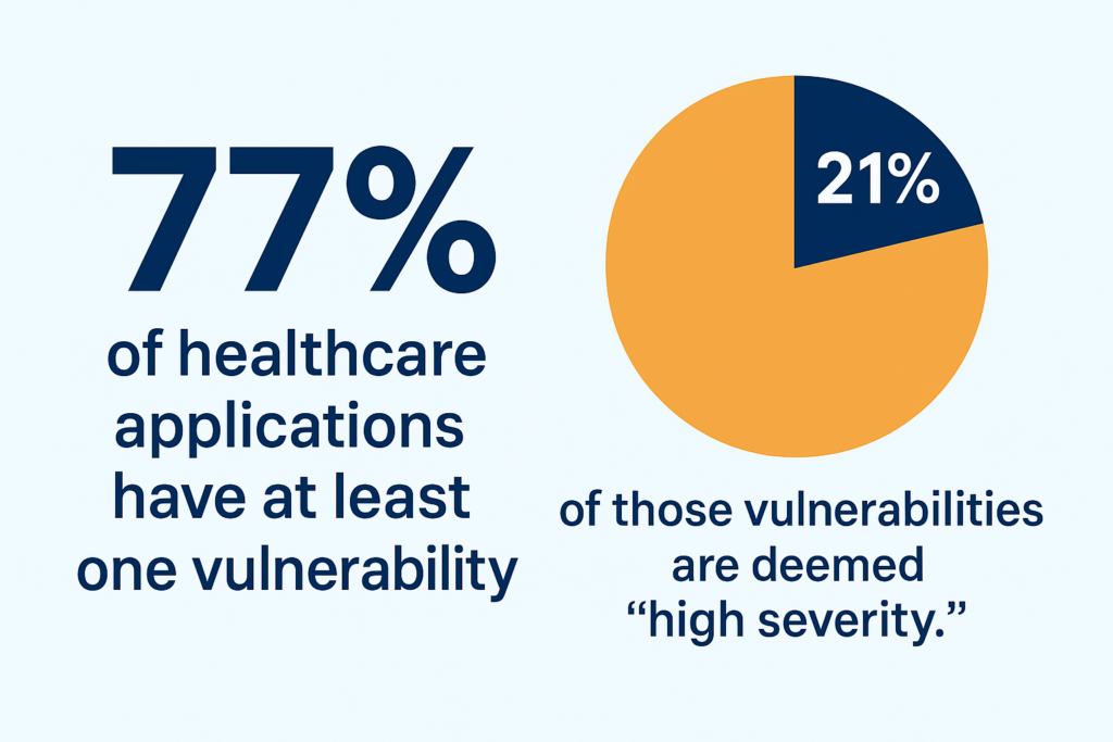 According to Veracode’s State of Software Security report, 77% of healthcare applications have at least one vulnerability, and **21% of those vulnerabilities are deemed “high severity.”